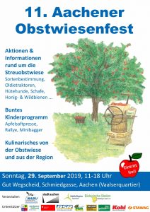 Gemeinsam mit der Stadt und der StädteRegion Aachen sowie der Biologischen Station der StädteRegion Aachen organisieren der NABU Aachen und die NABU-Naturschutzstation Aachen das 11. Aachener Obstwiesenfest. In diesem Jahr findet es wieder auf Gut Wegscheid im Vaalserquartier, Schmiedgasse 7 statt.