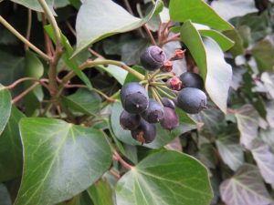 Auch nach dem Verblühen ist der Efeu eine wichtige Nahrungsquelle. Die im Winter blauschwarz heranreifenden Früchte werden vor allem von Staren, Amseln und anderen Vogelarten gerne gefressen.