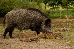 Bei uns ist das Wildschwein so gut wie flächendeckend verbreitet. Sie leben zusammen in einer Rotte. Angeführt wird die Rotte in der Regel von dem ältesten und erfahrensten Tier, der Leitbache. Außerhalb der Paarungszeit sind die männlichen Tiere (Keiler) Einzelgänger. Nur in den ersten Lebensmonaten leben sie auch mit in der Rotte. Eine Bache bringt ihre 4 – 6 Jungen von März bis Mai zur Welt. Die Frischlinge werden sehend und behaart geboren.
