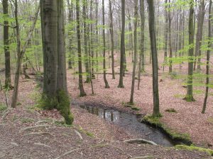The area of around 18,000 m² was taken out of forestry use and is also to be protected as part of a nature reserve designated in the new landscape plan. The area is characterized by its high proportion of native trees and shrubs. In addition to the predominant species copper beech, common oak and scattered sand birch and ash grow here. Some of the stands have reached an advanced age - the oaks are sometimes around 200 years old or older. The herb and shrub layer is developed to varying degrees. The herb layer is only sparsely developed in the beech stands in particular, as little light reaches the ground here. The Beverbach, which is characterized by its near-natural, meandering course, flows through the forest wilderness area. Another stream flows into the Beverbach, which is also developed in a near-natural state.