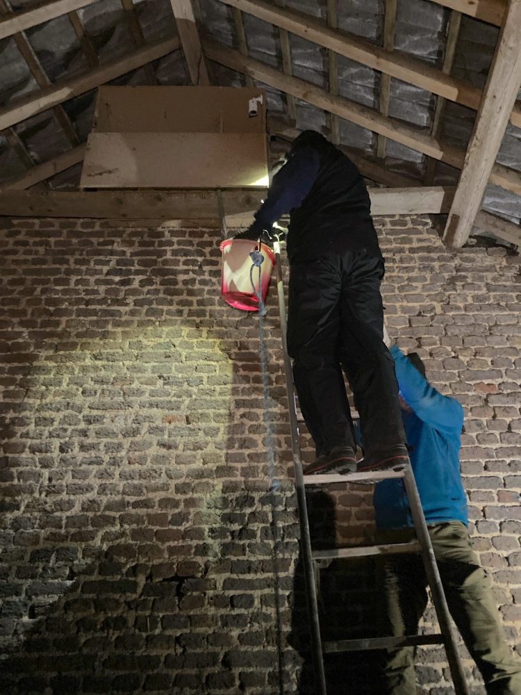 Fledermäuse? Nein, hier geht es um Schleiereulenkästen. Alf (Alfred Halsband) kümmert sich einmal im Jahr um die Schleiereulenkästen und die Falkenkästen im Dom und in der Jakobskirche. Hier wird, wenn nötig, gereinigt und neu eingestreut. Ein nicht ungefährliches Unterfangen, hängen die Kästen doch bis zu 6m hoch in Scheunen, deren Boden im Winter natürlich mit Strohballen bedeckt sind. Hier sind mindestens drei Menschen gefragt um die Aktion abzusichern.